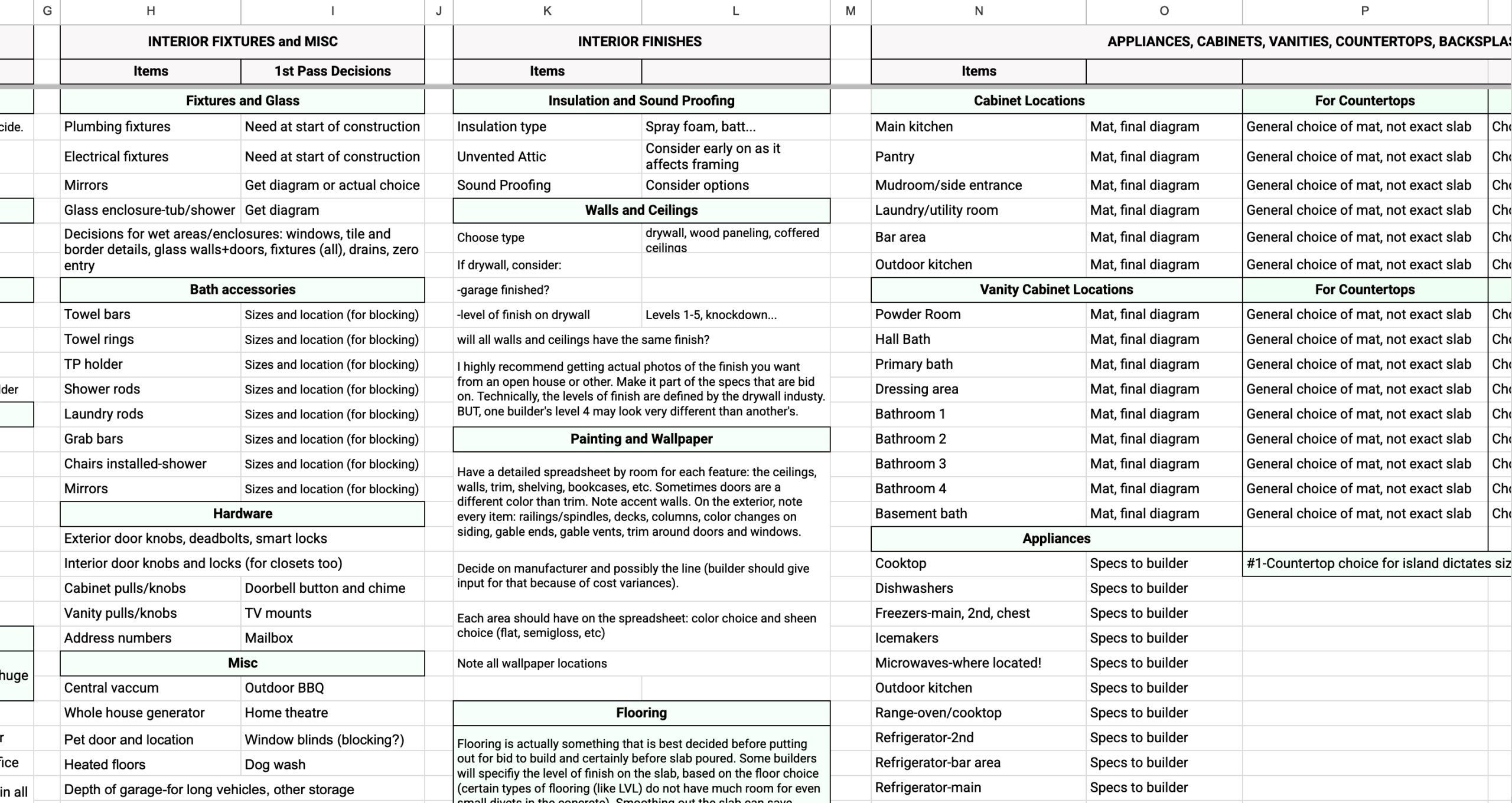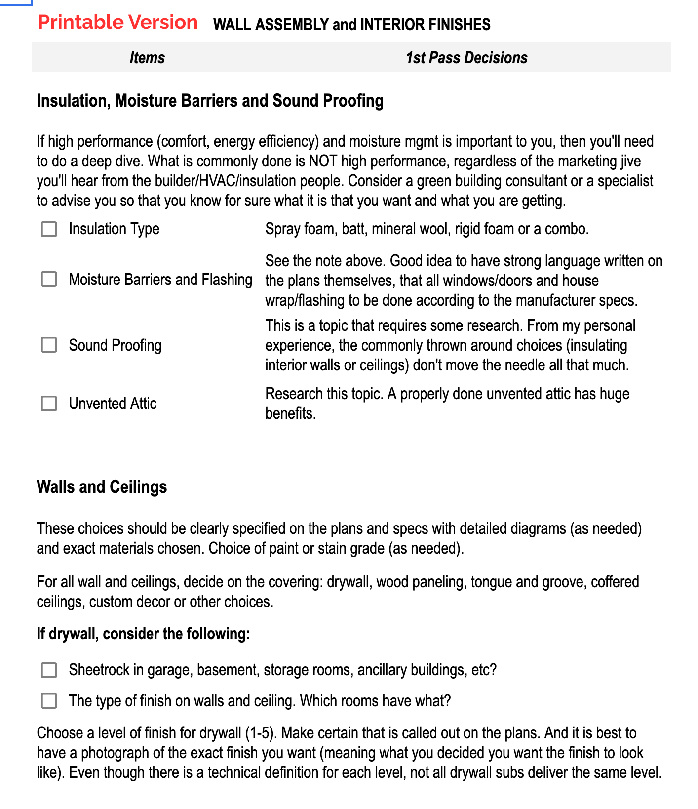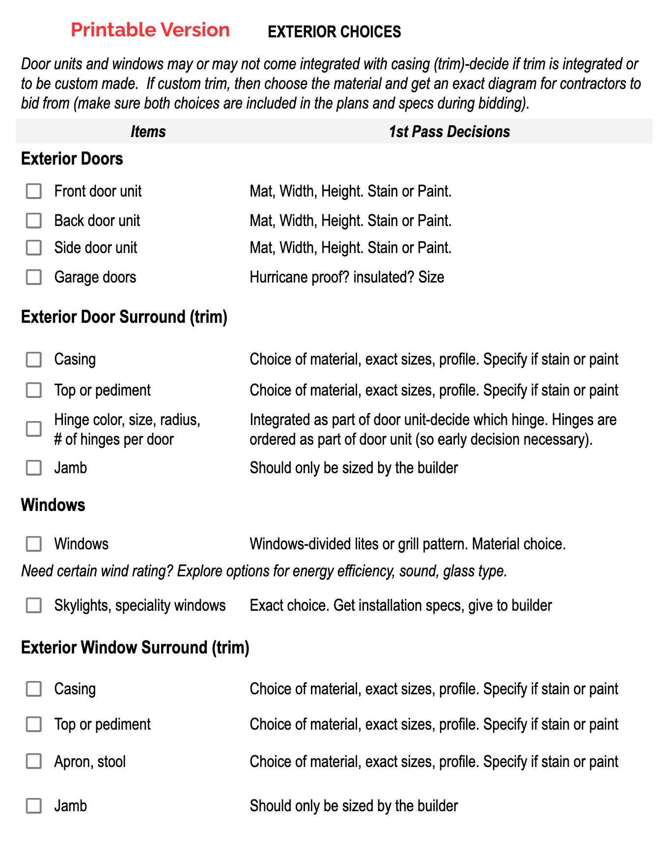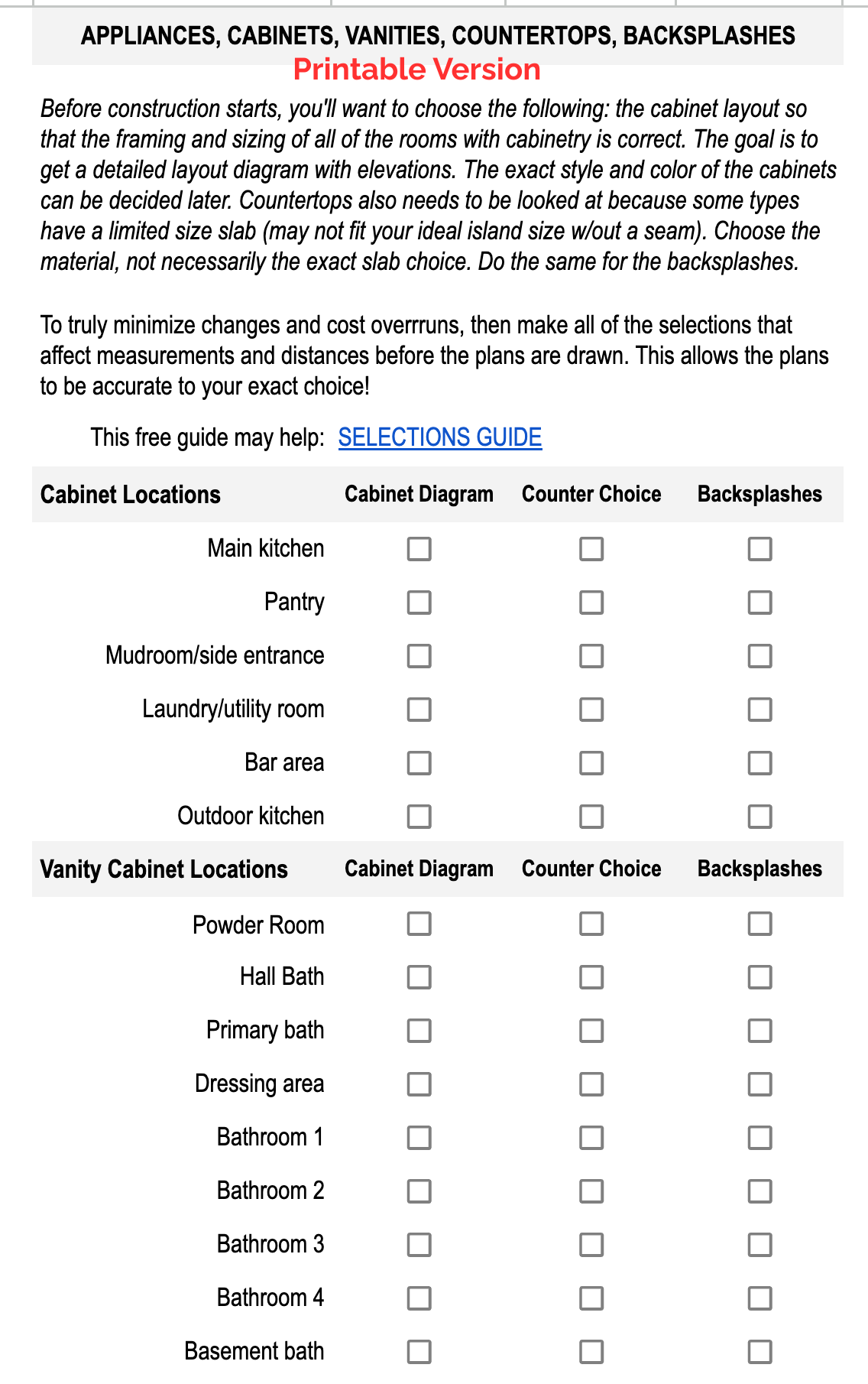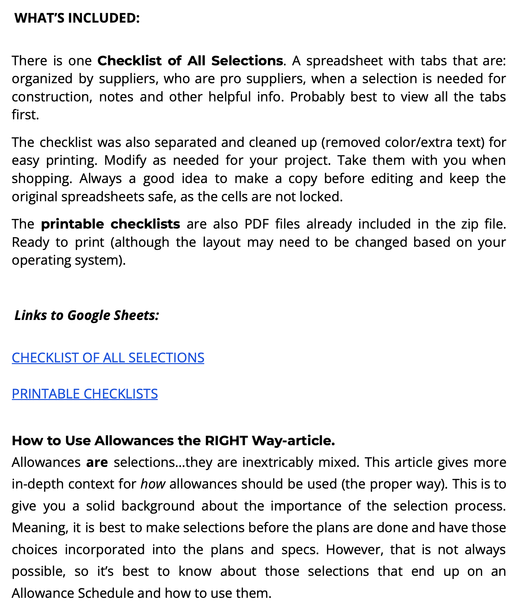 ✓ The Complete Selections Checklist A spreadsheet organized by location in the house, professional supplier, and when each selection is needed for construction. Includes tips on finding professional suppliers, "remember this" notes for key selections, and "don't do that" warnings where it counts.